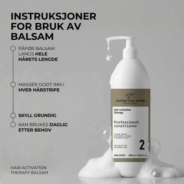 Balsam (1000 ml): Påfør i rent, fuktig hår langs hele hårets lengde helt ut til tuppene. Masser produktet godt inn i hver hårstripe og skyll grundig.